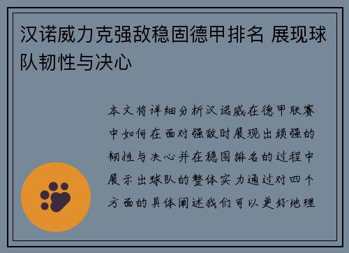 本文将详细分析汉诺威在德甲联赛中,如何在面对强敌时,展现出顽强的韧性与决心,并在稳固排名的过程中展示出球队的整体实力。通过对四个方面的具体阐述,我们可以更好地理解汉诺威的成功之道:一是球队整体的战术执...