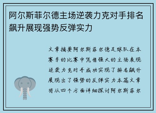 阿尔斯菲尔德主场逆袭力克对手排名飙升展现强势反弹实力