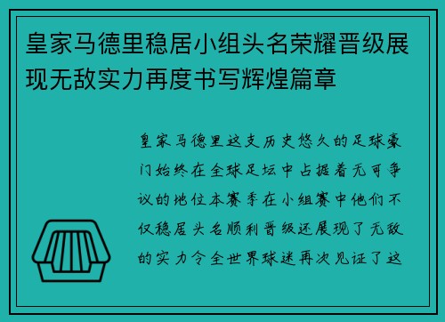 皇家马德里稳居小组头名荣耀晋级展现无敌实力再度书写辉煌篇章