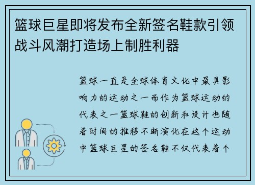 篮球巨星即将发布全新签名鞋款引领战斗风潮打造场上制胜利器